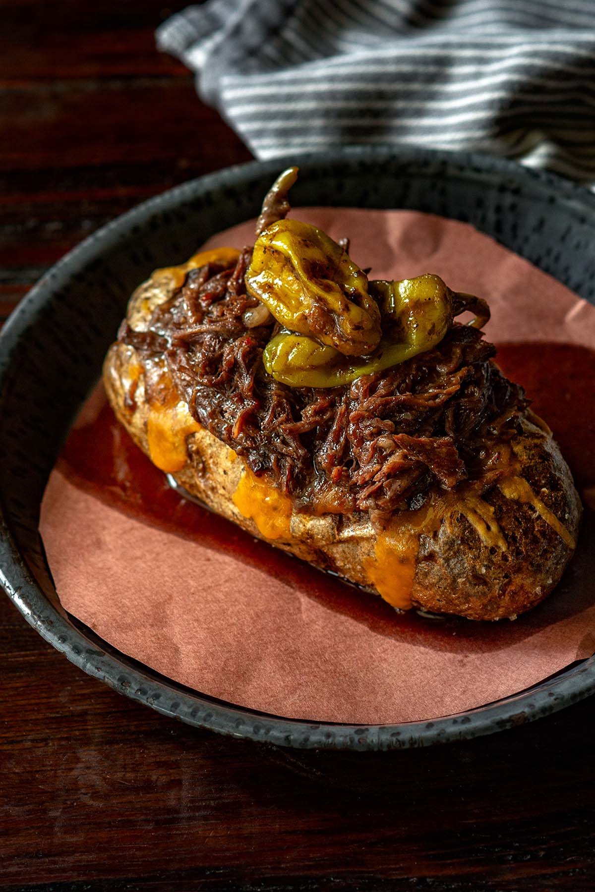 The chuck roast is cooked low and slow, allowing the connective tissue to break down, resulting in extremely tender, fall-apart meat.